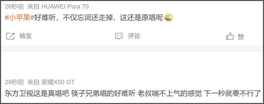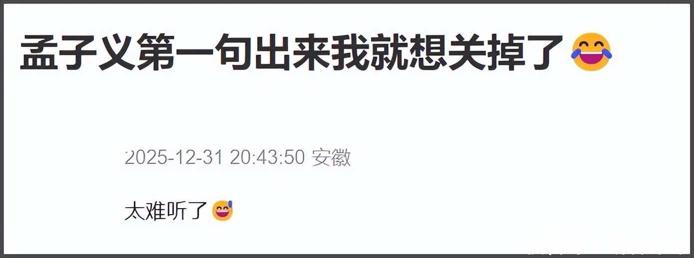 孟子义更是出场就被吐槽唱得从邡,修音齐修成电音了,齐没挽回跑调,纯靠热度在撑场子。唱歌的时刻发话器差点怼到鼻子上,这是或许被别东说念主发现我方对口型假唱吗?