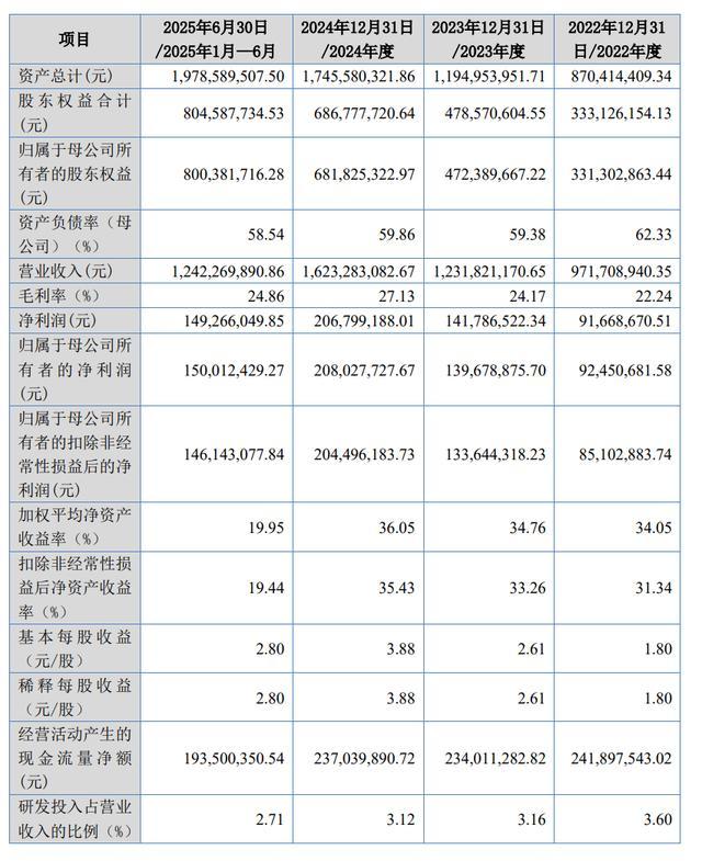 表现期内,公司主营业务收入分别为96,865.81万元、123,008.19万元、162,072.03万元及124,187.30万元,2023年较2022年收入加多 26.99%,2024年较2023年收入加多31.76%,2025年1-6月比上年同期收入加多38.80%。