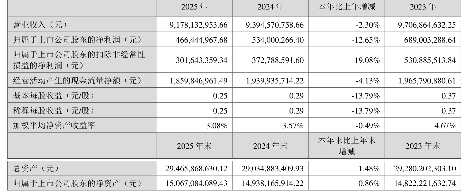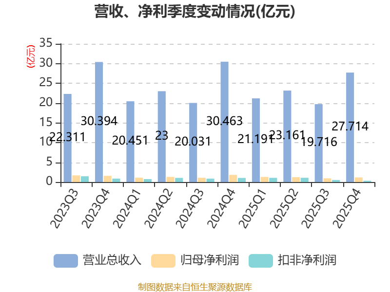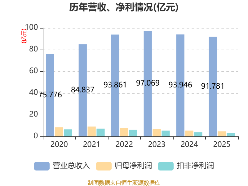 中证智能财讯华数传媒(000156)3月21日线路2025年年度讲演。2025年,公司达成贸易总收入91.78亿元,同比下跌2.30%;归母净利润4.66亿元,同比下跌12.65%;扣非净利润3.02亿元,同比下跌19.08%;打算手脚产生的现款流量净额为18.6亿元,同比下跌4.13%;讲演期内,华数传媒基本每股收益为0.25元,加权平均净钞票收益率为3.08%。公司2025年度分派预案为:拟向合座推进每10股派现1.6元(含税)。