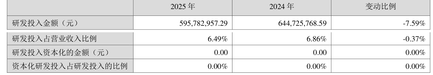 2025年全年,公司研发参预金额为5.96亿元,同比下跌7.59%;研发参预占贸易收入比例为6.49%,比较上年同时下跌0.37个百分点。此外,公司全年研发参预成本化率为0%。